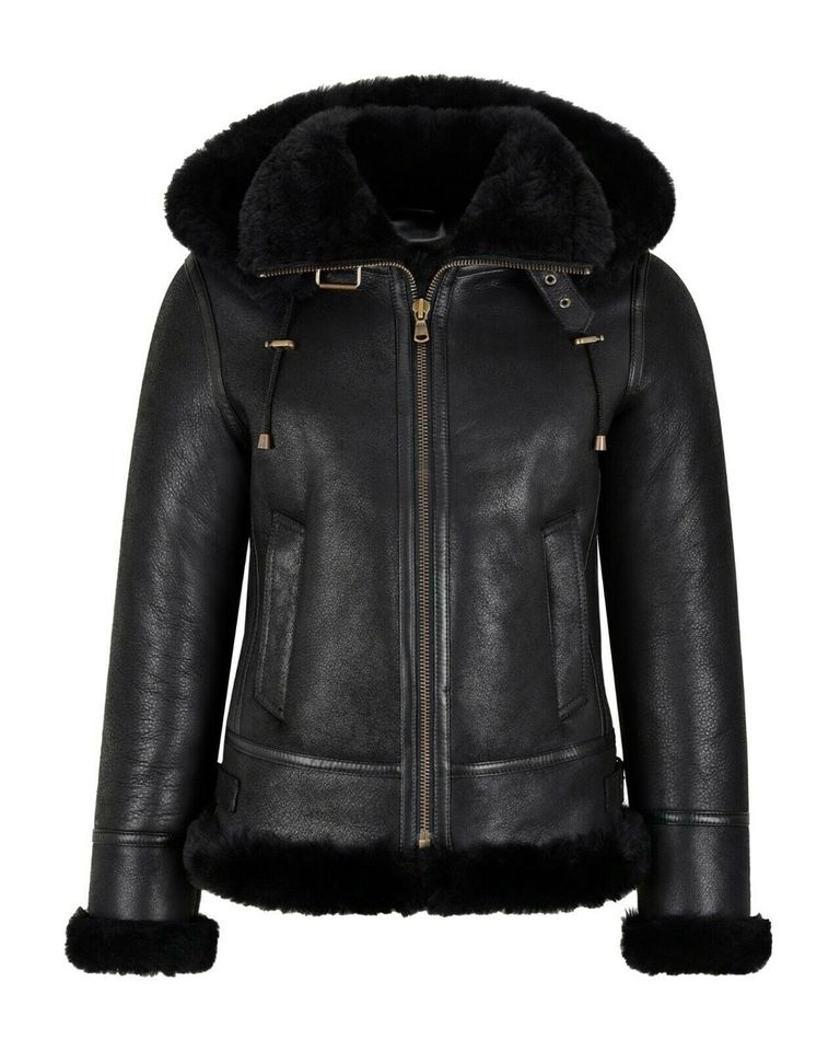 Womens B3 Bomber Hooded Classic Black Shearling Leather Jacket