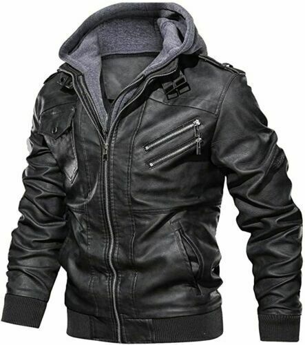 Men’s Casual Stand Collar Leather Zip-Up Motorcycle Bomber Jacket removable Hood